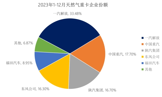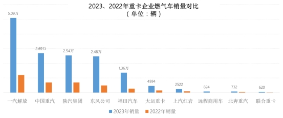 上圖可見,銷量前五企業(yè)中,解放、東風(fēng)和福田高于此增幅,分別增長(zhǎng)323%、407%和390%。2023年天然氣重卡市場(chǎng)約11.5萬輛的“增量”中,主要由排名靠前的企業(yè)貢獻(xiàn),貢獻(xiàn)最大的是排名第一的解放,燃?xì)廛噧粼鲩L(zhǎng)3.88萬輛,對(duì)整個(gè)市場(chǎng)增量的貢獻(xiàn)度超過1/3;重汽、陜汽、東風(fēng)和福田也均增長(zhǎng)超萬輛。