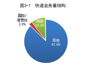 2023年,同城、異地、國際/港澳臺快遞業務量分別占全部快遞業務量的10.3%、87.4%和2.3%;業務收入分別占全部快遞收入的5.9%、49.7%和11.6%。與去年同期相比,同城快遞業務量的比重下降1.3個百分點,異地快遞業務量的比重上升0.8個百分點,國際/港澳臺業務量的比重上升0.5個百分點。