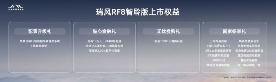 在發布現場瑞風RF8智聆版以16.99-23.99萬元的售價區間,同步開啟配置升級禮、貼心金融禮、無憂換購禮、闔家暢享禮等多重政策,預訂用戶同時疊加全部的預售與上市權益。此外,從即日起到3月31日,所有大定用戶在享受預售價的基礎上現金直減 8888元。除了正式上市的智聆版,瑞風RF8鴻蒙版同步啟動預售,預售價格為20.9925.99萬元,即刻預訂享受訂車無憂禮、用車無憂禮兩大權益,并將于4月開啟交付。