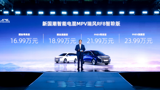 背靠江汽集團體系實力加持,瑞風RF8凝聚用戶共創智慧,并為用戶多元化場景打造的最佳的MPV出行解決方案。瑞風RF8完美契合用戶“既要、又要、還要”的需求,成為最適合中國用戶出行的智能電混MPV,期待為用戶帶來“智領從容”的出行體驗!從今天開始,中國智能電混MPV市場正式進入嶄新時代。