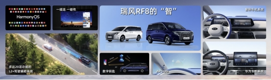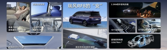 第一,瑞風RF8是首款搭載華為車機的智能座艙MPV,操作系統帶來天花板級別的智能座艙體驗。第二,也是行業第一款搭載星火認知大模型的MPV,借助訊飛星火大模型學習用戶行為,智能語音交互體驗便捷。第三,行業第一款搭載3DHT智慧電混的MPV,帶來優于單檔或兩檔DHT混動系統的動力性能體驗。第四,44.55度大圓柱電池帶來行業第一的252公里純電續航里程。第五,行業首款獲得中國汽車安全大會“中國十佳車身”“最佳結構獎”雙獎的MPV,安全性能行業領先。第六,行業率先搭載的前后雙向AEB 智能制動輔助系統,全面保障行車安全。第七,瑞風RF8成為首款通過中汽研六維電安全認證的MPV416項嚴苛測試全部表現優異。第八,行業第一個獲得中汽研“中國健康汽車”認證的MPV,給予用戶每一程的清新健康座艙體驗。