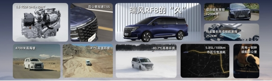“久”,在于澎湃動力的持久輸出,以及恒久可靠的品質呈現。超高熱效率的1.5TGDI DHE+3DHT+雙電機方案,綜合功率310KW,綜合扭矩745N·M,作為全球首款3DHT智能電混MPV,零百加速、起步加速、超車加速的動力性能不輸同級產品。強動力之外,更有低能耗。瑞風RF8實測市區虧電油耗 5.85L每百公里、高速虧電油耗 7.81L每百公里,用戶僅需加注92號汽油即可穩定輸出澎湃動力,降低用戶成本。純電出行更是將出行成本降低到極致,插混MPV中容量最大的 44.55度 三元大圓柱電池,帶來252公里的超長純電續航,超級閃充技術實現充電一刻鐘,續航百公里,從3080%僅需20分鐘。