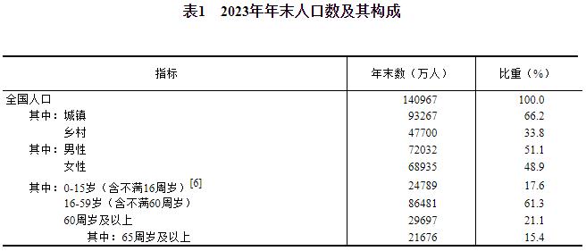 [6]2023年年末,0-14歲(含不滿15周歲)人口為23063萬人,15-59歲(含不滿60周歲)人口為88207萬人。