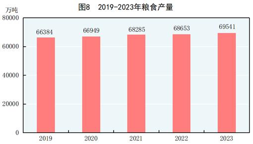 全年糧食產量69541萬噸,比上年增加888萬噸,增產1.3%。其中,夏糧產量14615萬噸,減產0.8%;早稻產量2834萬噸,增產0.8%;秋糧產量52092萬噸,增產1.9%。谷物產量64143萬噸,比上年增產1.3%。其中,稻谷產量20660萬噸,減產0.9%;小麥產量13659萬噸,減產0.8%;玉米產量28884萬噸,增產4.2%。大豆產量2084萬噸,增產2.8%。