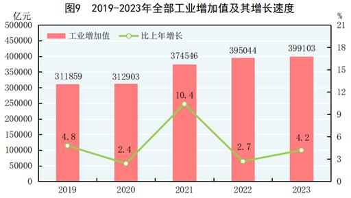 全年全部工業增加值399103億元,比上年增長4.2%。規模以上工業增加值增長4.6%。在規模以上工業中,分經濟類型看,國有控股企業增加值增長5.0%;股份制企業增長5.3%,外商及港澳臺商投資企業增長1.4%;私營企業增長3.1%。分門類看,采礦業增長2.3%,制造業增長5.0%,電力、熱力、燃氣及水生產和供應業增長4.3%。