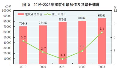 全年建筑業增加值85691億元,比上年增長7.1%。全國具有資質等級的總承包和專業承包建筑業企業利潤8326億元,比上年增長[27]0.2%,其中國有控股企業4019億元,增長4.3%。