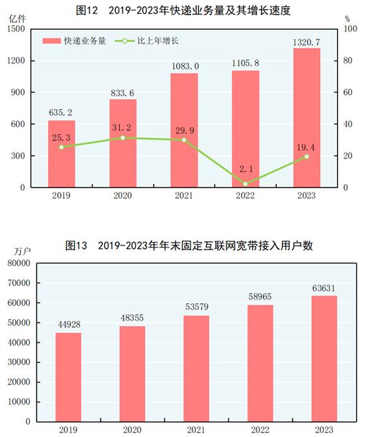 全年完成郵政行業寄遞業務總量[29]1625億件,比上年增長16.8%。郵政業完成郵政函件業務9.7億件,包裹業務0.2億件,快遞業務量1320.7億件,快遞業務收入12074億元。全年完成電信業務總量[30]18327億元,比上年增長16.8%。年末移動電話基站數[31]1162萬個,其中4G基站629萬個,5G基站338萬個。全國電話用戶總數189992萬戶,其中移動電話用戶172660萬戶。移動電話普及率為122.5部/百人。固定互聯網寬帶接入用戶[32]63631萬戶,比上年末增加4666萬戶,其中100M速率及以上的寬帶接入用戶[33]60136萬戶,增加4756萬戶。蜂窩物聯網終端用戶[34]23.32億戶,增加4.88億戶。互聯網上網人數10.92億人,其中手機上網人數10.91億人。互聯網普及率為77.5%,其中農村地區互聯網普及率為66.5%。全年移動互聯網用戶接入流量3015億GB,比上年增長15.2%。軟件和信息技術服務業[35]完成軟件業務收入123258億元,比上年增長13.4%。
