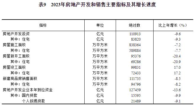 全年房地產開發投資110913億元,比上年下降[43]9.6%。其中住宅投資83820億元,下降9.3%;辦公樓投資4531億元,下降9.4%;商業營業用房投資8055億元,下降16.9%。全年新建商品房銷售面積[44]111735萬平方米。二手房交易網簽面積[45]70882萬平方米。年末新建商品房待售面積67295萬平方米,其中商品住宅待售面積33119萬平方米。