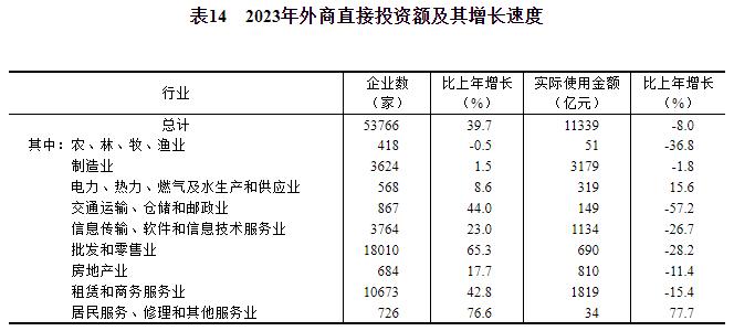 全年外商直接投資新設立企業53766家,比上年增長39.7%。實際使用外商直接投資額11339億元,下降8.0%,折1633億美元,下降13.7%。其中,共建“一帶一路”國家對華直接投資(含通過部分自由港對華投資)新設立企業13649家,增長82.7%;對華直接投資額1221億元,下降11.4%,折176億美元,下降16.7%。高技術產業實際使用外資額4233億元,下降4.9%,折610億美元,下降10.8%。