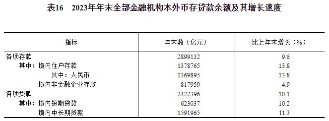 全年社會融資規模增量[48]35.6萬億元,按可比口徑計算,比上年多3.4萬億元。年末社會融資規模存量[49]378.1萬億元,按可比口徑計算,比上年末增長9.5%,其中對實體經濟發放的人民幣貸款余額235.5萬億元,增長10.4%。年末全部金融機構本外幣各項存款余額289.9萬億元,比年初增加25.4萬億元,其中人民幣各項存款余額284.3萬億元,增加25.7萬億元。全部金融機構本外幣各項貸款余額242.2萬億元,增加22.2萬億元,其中人民幣各項貸款余額237.6萬億元,增加22.7萬億元。人民幣普惠小微貸款[50]余額29.4萬億元,增加5.6萬億元。人民幣制造業中長期貸款余額12.2萬億元,增加3.1萬億元。