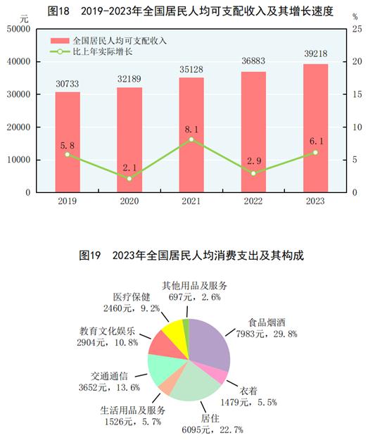 全年全國居民人均可支配收入39218元,比上年增長6.3%,扣除價格因素,實際增長6.1%。全國居民人均可支配收入中位數[56]33036元,增長5.3%。按常住地分,城鎮居民人均可支配收入51821元,比上年增長5.1%,扣除價格因素,實際增長4.8%。城鎮居民人均可支配收入中位數47122元,增長4.4%。農村居民人均可支配收入21691元,比上年增長7.7%,扣除價格因素,實際增長7.6%。農村居民人均可支配收入中位數18748元,增長5.7%。城鄉居民人均可支配收入比值為2.39,比上年縮小0.06。按全國居民五等份收入分組[57],低收入組人均可支配收入9215元,中間偏下收入組人均可支配收入20442元,中間收入組人均可支配收入32195元,中間偏上收入組人均可支配收入50220元,高收入組人均可支配收入95055元。全國農民工人均月收入4780元,比上年增長3.6%。脫貧縣[58]農村居民人均可支配收入16396元,比上年增長8.5%,扣除價格因素,實際增長8.4%。
