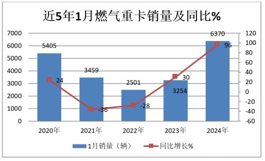 不僅如此,業內普遍預測今年燃氣重卡市場仍然會持續火爆,因此導致供給側及終端用戶均對2024年的燃氣重卡市場都寄予厚望!據終端上牌數據顯示,今年1月燃氣重卡銷售6370輛,同比去年1月的3254輛大漲96%,環比2023年12月的6140輛增長4%,實現了同環比“雙增長”。