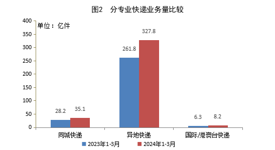 一季度,同城快遞業務量累計完成35.1億件,同比增長24.4%;異地快遞業務量累計完成327.8億件,同比增長25.2%;國際/港澳臺快遞業務量累計完成8.2億件,同比增長28.5%。