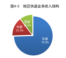 一季度,東、中、西部地區快遞業務量比重分別為72.8%、18.6%和8.6%,業務收入比重分別為74.5%、15.1%和10.4%。與去年同期相比,東部地區快遞業務量比重下降2.2個百分點,快遞業務收入比重下降1.2個百分點;中部地區快遞業務量比重上升1.4個百分點,快遞業務收入比重上升0.7個百分點;西部地區快遞業務量比重上升0.8個百分點,快遞業務收入比重上升0.5個百分點。