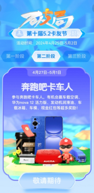 4月27日-5月1日,“第十屆5.2卡友節”前夕,登錄“卡友地帶”APP,參與首頁《奔跑吧卡車人》互動小游戲,就有機會贏取車載空調、華為nova 12活力版、發動機潤滑油、車載冰箱、車模、現金紅包等超多獎勵!