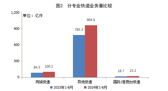 1-8月,同城快遞業(yè)務(wù)量累計(jì)完成100.2億件,同比增長18.9%;異地快遞業(yè)務(wù)量累計(jì)完成964.6億件,同比增長22.8%;國際/港澳臺(tái)快遞業(yè)務(wù)量累計(jì)完成23.2億件,同比增長24.2%。