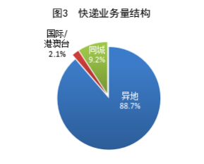 1-8月,同城、異地、國際/港澳臺(tái)快遞業(yè)務(wù)量分別占全部快遞業(yè)務(wù)量的9.2%、88.7%和2.1%。與去年同期相比,同城快遞業(yè)務(wù)量的比重下降0.3個(gè)百分點(diǎn),異地快遞業(yè)務(wù)量的比重上升0.3個(gè)百分點(diǎn),國際/港澳臺(tái)業(yè)務(wù)量的比重基本持平。