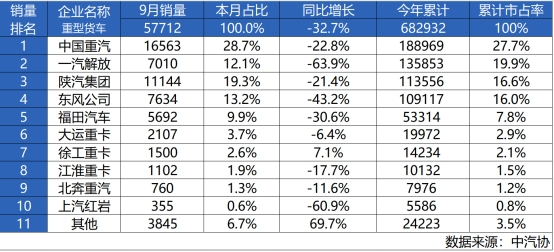 2024年第三季度收官之戰已落幕,中國重卡市場在宏觀經濟波動與終端需求疲軟等多重因素的影響下,正緩步前行在挑戰與機遇并存的道路上。根據中汽協數據,9月份我國重卡市場銷售57712輛,環比8月份銷量下滑7.6%,比上年同期的8.57萬輛下滑32.7%;2024年累計銷售共計682932輛,同比下降3.4%。面對外部環境的重重挑戰,企業如何在激烈的市場競爭中破局,成為行業關注的焦點。