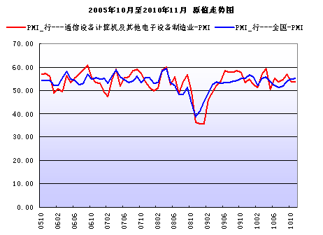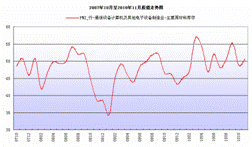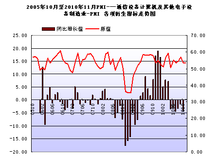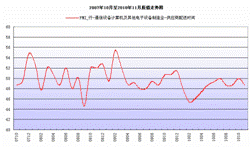 11月份,通信設備計算機及其他電子設備制造業購進價格指數為56.1,比上月上升2.9個百分點,與去年同期相比上升5.5個百分點;采購量指數為55.0,比上月上升0.4個百分點,與去年同期相比下降2.1個百分點。