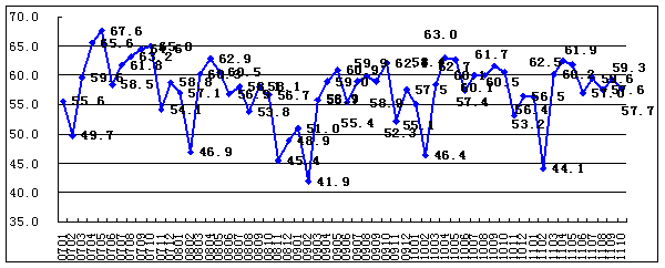 2011年10月,中國物流與采購聯(lián)合會(CFLP)發(fā)布的中國非制造業(yè)商務活動指數(shù)為57.7%,比上月回落1.6個百分點。由于非制造業(yè)沒有綜合指數(shù),通常以商務活動指數(shù)來反映非制造業(yè)經(jīng)濟的總體變化。本月中國非制造業(yè)PMI各單項指數(shù)中,新出口訂單指數(shù)和供應商配送時間指數(shù)較上月小幅上升,其余各指數(shù)的環(huán)比均呈現(xiàn)不同程度回落。