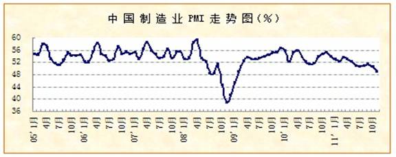 2011年11月份,中國物流與采購聯合會發布的中國制造業采購經理指數(PMI)為49.0%,環比回落1.4個百分點。從11個分項指數來看,同上月相比,只有產成品庫存指數、進口指數上升,分別上升2.8和0.3個百分點;其余各指數均有所回落,其中新訂單指數、新出口訂單指數回落幅度較大,超過2個百分點,均回落到50%以內。