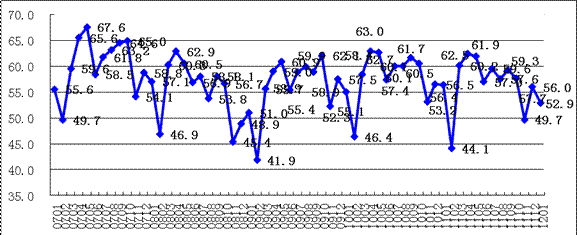 中國非制造業(yè)商務(wù)活動(dòng)指數(shù)走勢(shì)圖(%)