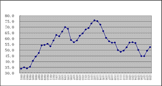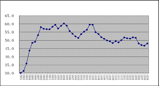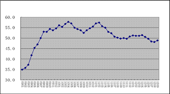 2009年1月-2012年9月全球制造業PMI指數走勢