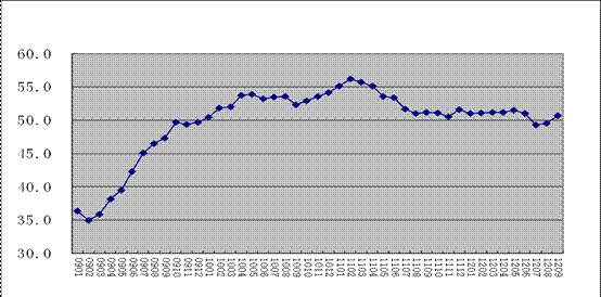 購進價格指數回升至50%以上。9月份,購進價格指數結束了連續三個月的下降走勢,回升至52.7%。購進價格的強勁回升,主要在源自于最近國際原油價格的上漲。