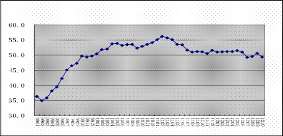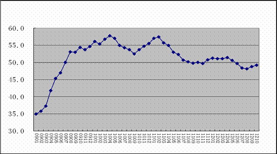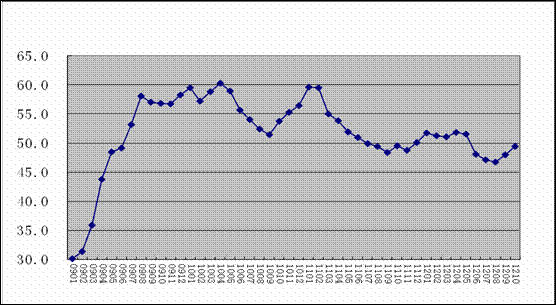 2009年1月-2012年10月全球制造業PMI指數走勢