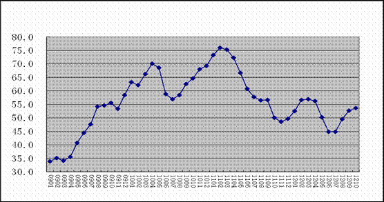 購進價格指數連續兩個月運行在50%以上。10月份,購進價格指數繼續運行在50%以上,環比上升1個百分點達到53.7%,創出近六個月的新高。