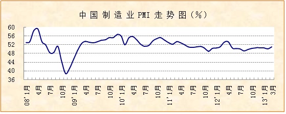 中國(guó)物流與采購(gòu)聯(lián)合會(huì)、國(guó)家統(tǒng)計(jì)局服務(wù)業(yè)調(diào)查中心發(fā)布的2013年3月份中國(guó)制造業(yè)采購(gòu)經(jīng)理指數(shù)(PMI)為50.9%,較上月上升0.8個(gè)百分點(diǎn),該指數(shù)連續(xù)6個(gè)月保持在50%以上。本月除個(gè)別指數(shù)外,主要分項(xiàng)指數(shù)均現(xiàn)回升。總的來看,當(dāng)前市場(chǎng)交易開始啟動(dòng),企業(yè)訂單增加,上游產(chǎn)品價(jià)格上漲動(dòng)能減弱,企業(yè)經(jīng)營(yíng)形勢(shì)趨好,經(jīng)濟(jì)運(yùn)行呈現(xiàn)穩(wěn)中趨升走勢(shì)。