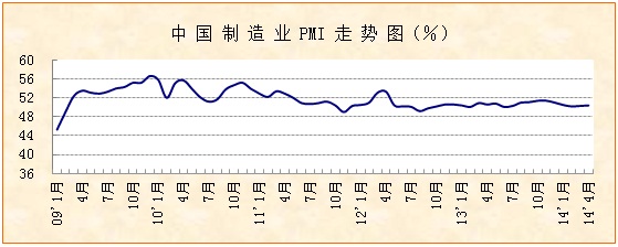 中國物流與采購聯(lián)合會、國家統(tǒng)計局服務(wù)業(yè)調(diào)查中心發(fā)布的2014年4月份中國制造業(yè)采購經(jīng)理指數(shù)(PMI)為50.4%,較上月微升0.1個百分點。本月PMI指數(shù)回升,主要受需求端帶動,新訂單指數(shù)回升明顯,反映出經(jīng)濟(jì)運行穩(wěn)中有升,增長態(tài)勢趨于鞏固。