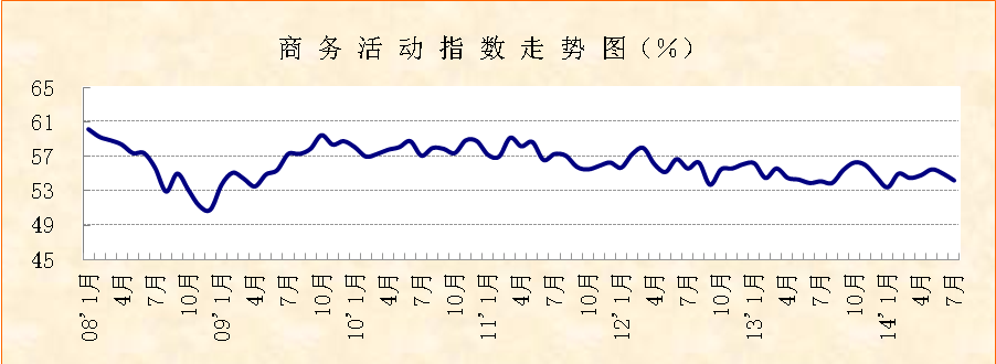 中國物流與采購聯合會、國家統計局服務業調查中心發布的2014年7月份商務活動指數較上月回落0.8個百分點,達到54.2%。從各分項指數看,新訂單指數與上月持平,新出口訂單指數小幅回落,中間投入價格指數和收費價格指數雙雙回調,業務活動預期指數上升,市場運行保持平穩。