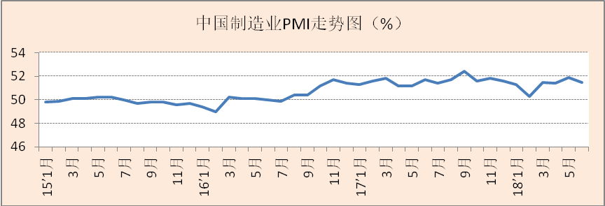 中國物流與采購聯合會、國家統計局服務業調查中心發布的2018年6月份中國制造業采購經理指數(PMI)為51.5%,較上月回落0.4個百分點,但仍保持在51%以上相對較高水平。綜合來看,經濟運行保持平穩,但對于供需和進出口回落態勢需關注。