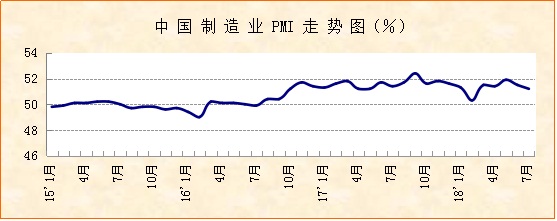 中國物流與采購聯(lián)合會、國家統(tǒng)計局服務(wù)業(yè)調(diào)查中心發(fā)布的2018年7月份中國制造業(yè)采購經(jīng)理指數(shù)(PMI)為51.2%,較上月回落0.3個百分點(diǎn),但仍保持在51%以上相對較高水平。綜合來看,經(jīng)濟(jì)運(yùn)行韌性較好。